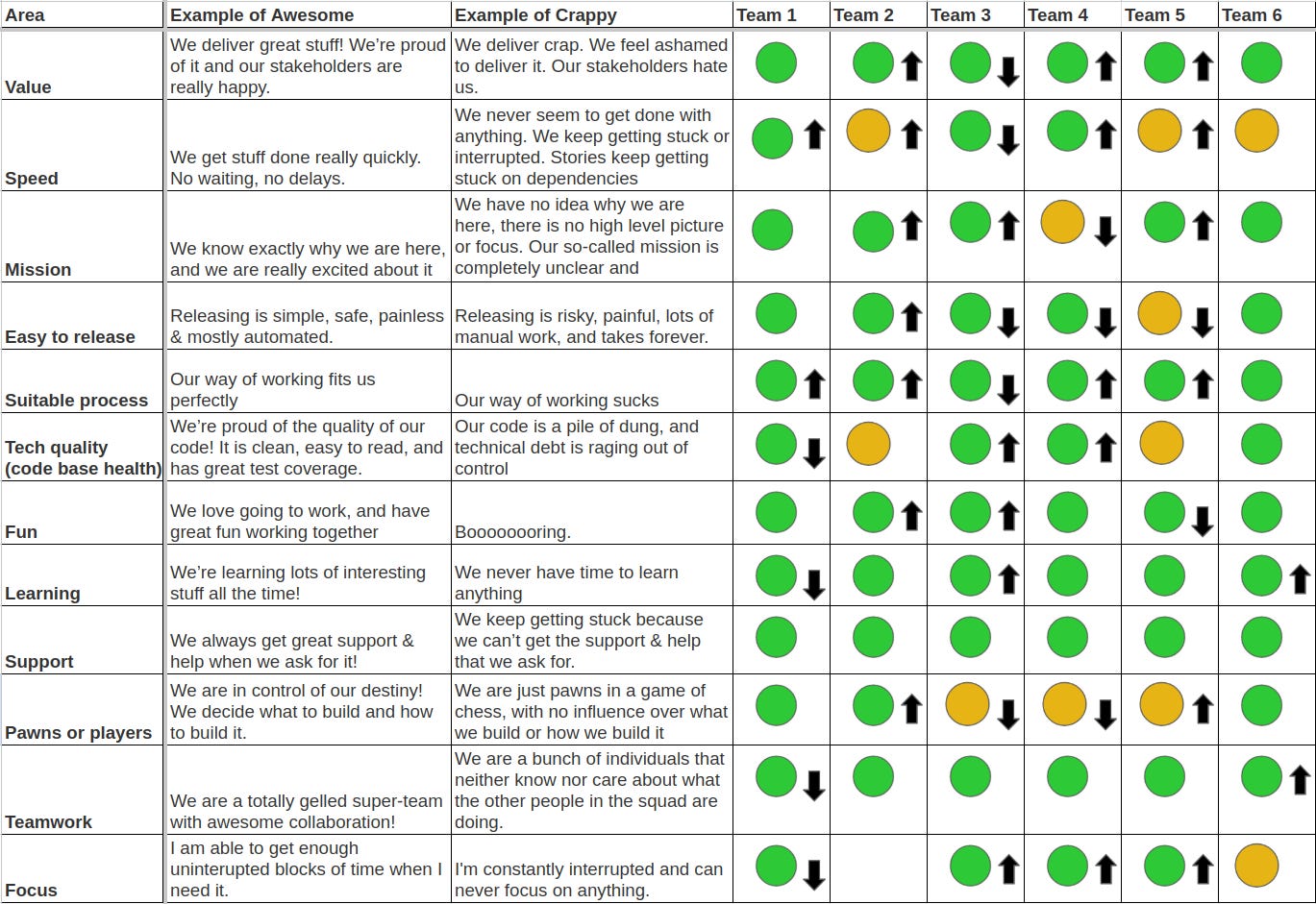In the past, we used a health check, a customised version of the Spotify Health Check for each product-engineering team, to measure culture and help address any issues. The health check had questions around value, speed, mission, releasability, process, quality, fun, learning, support, autonomy, teamwork and focus. Each team would regularly run the check as a retrospective, and they were helpful for teams to reflect and learn and for insights. Team-level insights provide direction for where the team leader may need to support the team. Department-level insights help identify systemic issues across multiple teams, allowing leadership to help. The image below shows the output of the Health Check across various teams, including the questions we asked.