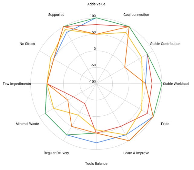 Another tool can be a lightweight, asynchronous pulse check to ask each team member questions to see if you are balancing the competing forces that pull against your culture. See this article for more details about the framework, which would centre around value, quality, speed, consistency, quantity and resilience. The diagram below shows the output of that.
